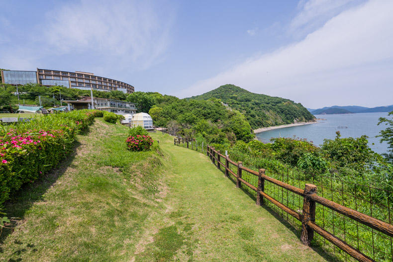 受付を済ませ、まず目に飛び込んでくるのが、播磨灘のオーシャンビューと言いたい所だが、この美しい緑の芝生だ。